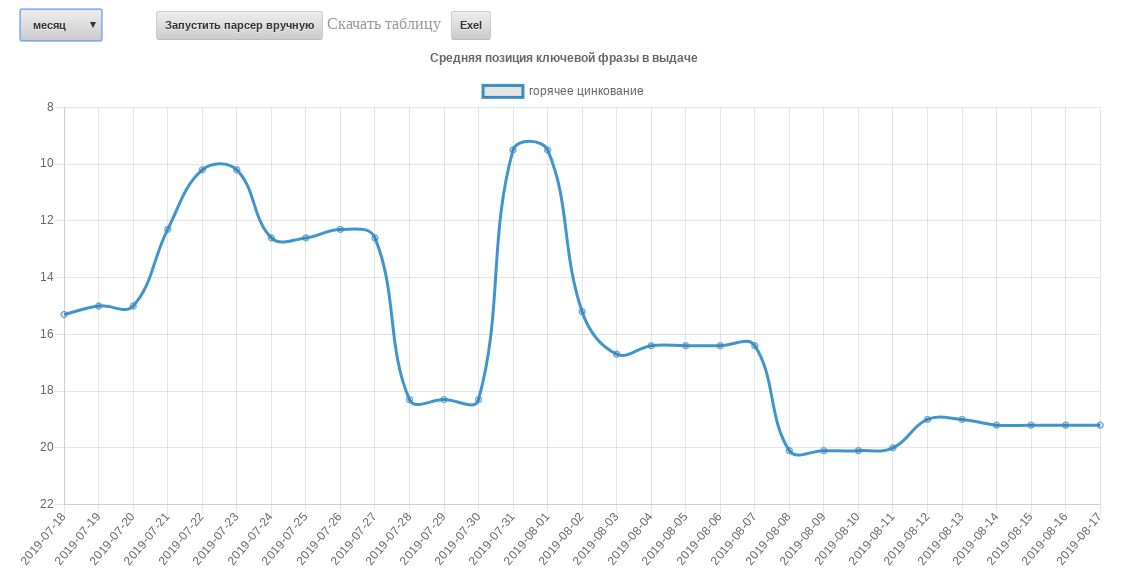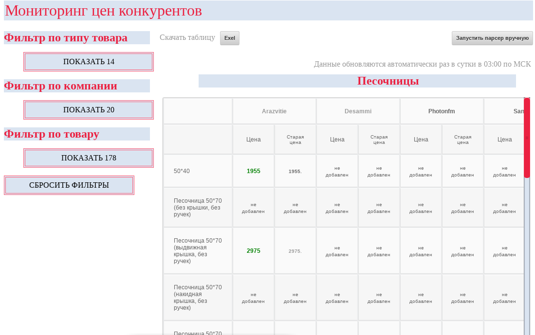 Данный инструмент позволяет мониторить цены на товары и услуги на сайтах в автоматизированном режиме. Ежедневно наш работ проходит указанные сайты и вносит данные в базу, которую в дальнейшем можно увидеть в табличном виде. Также робота можно запускать и вручную.