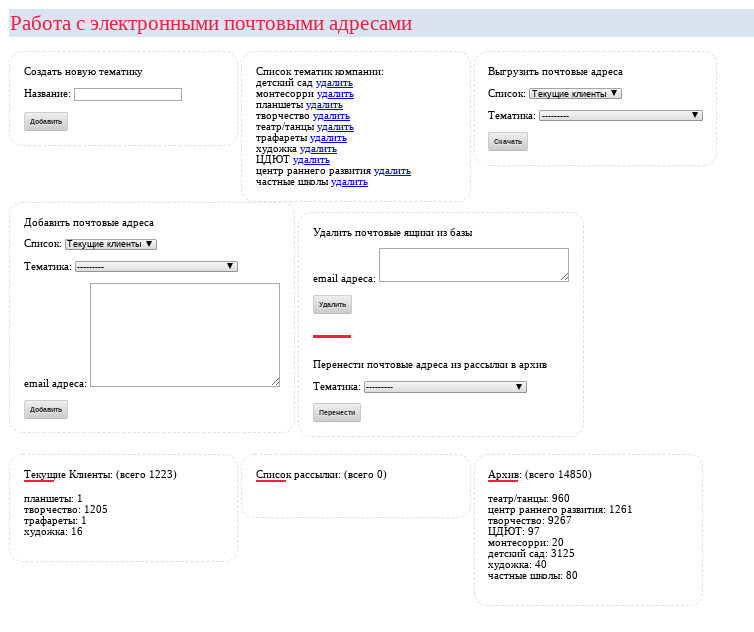 В пакете также в качестве бонуса предоставляется доступ к инструменту "Работа с почтами". В нем можно набивать, хранить и редактировать базу e-mail адресов. Предусмотрено деление на разные списки, например, "текущие клиенты", "потенциальные клиенты" и пр., категории.